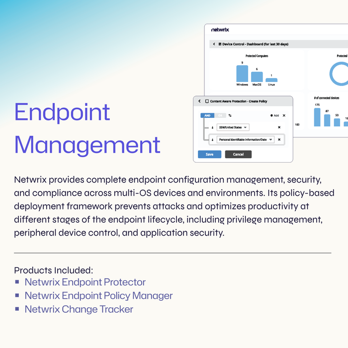 Netwrix Endpoint Management solutions provide device control, content-aware DLP, and least-privilege enforcement across Windows, macOS, and Linux. They protect sensitive data from leakage via removable media, email, or cloud services while simplifying endpoint security at scale.